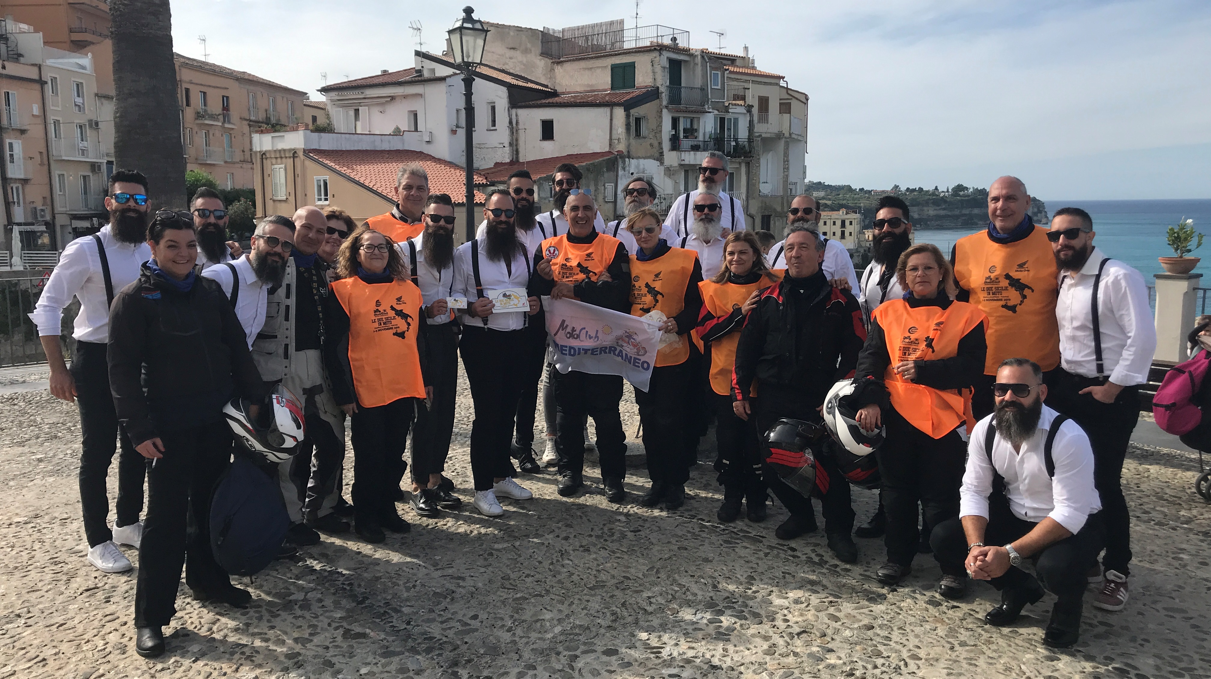 Fermarsi a Tropea è stata una tappa obbligata. Lì succede una cosa simpaticissima; sulla magnifica terrazza dei due cannoni notiamo un nutrito gruppo di ragazzi con belle barbe lunghe e tutti vestiti allo stesso modo con camicia bianca e pantaloni blu. Scambiando due parole scopriamo che fanno parte di un associazione benefica, Bearded Villans, che stavano facendo un gemellaggio con la loro consorella calabrese. La loro manifestazione, guarda caso, si chiama “Le Due Sicilie”, la nostra “Le Due Sicilie in Moto”. Con una grande risata si è creato un clima di fratellanza e socialità incredibile fra barbuti e motociclisti con scambio di patch e adesivi.