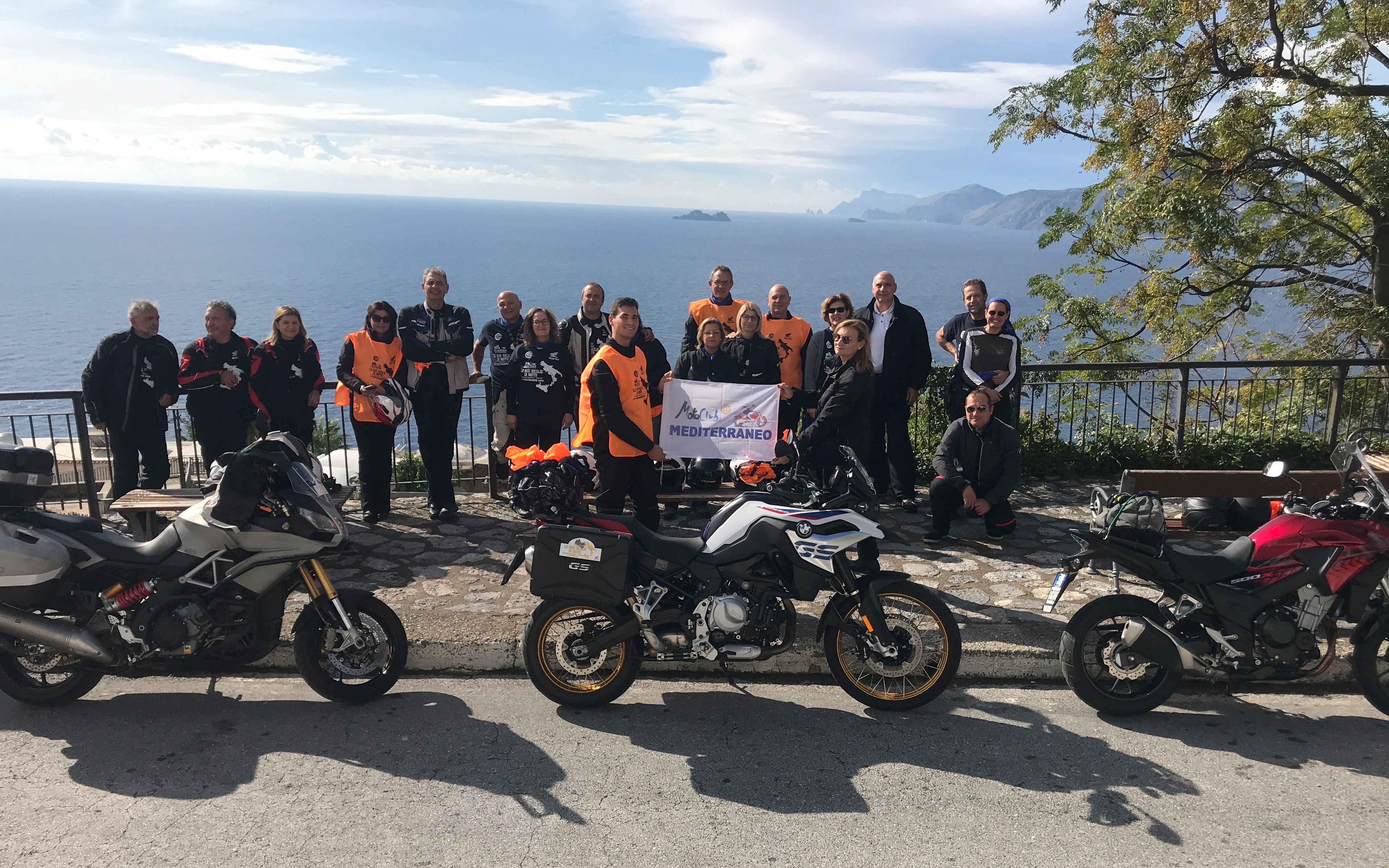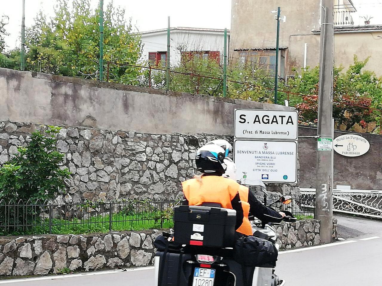 Lasciata Praiano, un magnifico sole ci accompagna e rende la Costiera Amalfitana ancora più affascinante; ammiriamo lo scorcio di Positano e ci spingiamo sui Colli di Fontanelle sulla strada meglio conosciuta come “Nastro Azzurro” dove ci aspetta il grande amico Guido Gargiulo, sorrentino d.o.c., che ci accompagnerà a Sant’Agata sui Due Golfi. Qui ci attende l’affettuosissimo Tonino Schisano che ci permette di parcheggiare le nostre moto nella sua villa con una bellissima vista su Capri che sembra quasi di toccarla